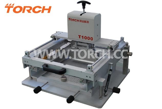 3、抬起印刷模板,取出PCB板,完成PCB板上焊盤的錫膏印刷過程,F(xiàn)有的全自動印刷機(jī)中帶動刮刀水平運(yùn)動的傳動裝置主要通過兩個(gè)相互平行的導(dǎo)軌配合高精密滾軸絲杠傳動,利用絲杠旋轉(zhuǎn)實(shí)現(xiàn)刮刀在水平方向的移動,其方式既有效保證了刮刀水平運(yùn)動、平穩(wěn)運(yùn)行的要求,而且印刷出的焊點(diǎn)均勻、可靠;手動印刷機(jī)一般采用橡膠刮刀,人工控制刮刀速度,角度和壓力。但是隨著電子行業(yè)的飛速發(fā)展,集成度越來越高的芯片不斷出現(xiàn),對印刷機(jī)的印刷精度提出的很大的挑戰(zhàn),特別是對于小型手動印刷機(jī)來說,行業(yè)中還停留在“沙模鑄鋁”和“純手動操作”階段,第一,平臺的問題滿足不了高精密的絲網(wǎng)印刷,第二,純手工的刮刀操作,使刮刀的角度,刮刀的壓力,刮刀的移動速度等都變得不可控,第三,精密印刷的一致性也不能保證,所以,T1000手動精密印刷機(jī)的出現(xiàn),解決了上述在手動印刷領(lǐng)域不能解決的問題。T1000手動精密印刷機(jī)的出現(xiàn),使電子廠僅僅用較低的成本就享受到了高昂的半自動或者全自動印刷機(jī)才有的功能,有效減低了生產(chǎn)成本,提高了印刷效率和印刷質(zhì)量。
