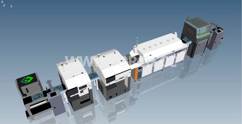 現(xiàn)場將演示在 MES控制下所有設(shè)備(自動上料機(jī)→焊膏噴印機(jī)→智能貼片機(jī)→再流焊機(jī)→AOI→ICT→自動組裝設(shè)備→自動功能測試設(shè)備→自動料倉)的協(xié)同工作以及3D仿真的虛擬工廠。