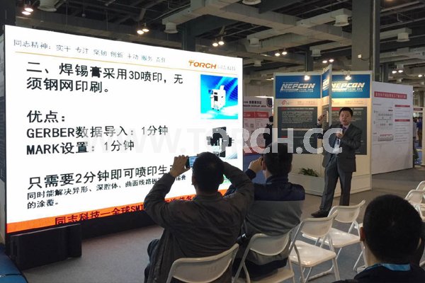 “NEPCON 與智慧工廠 1.0-電子制造的未來”主題研討會現(xiàn)場照片,圖片是北京中科同志科技股份有限公司總經(jīng)理趙永先先生在做“柔性電子制造SMT生產(chǎn)線”的演講!
