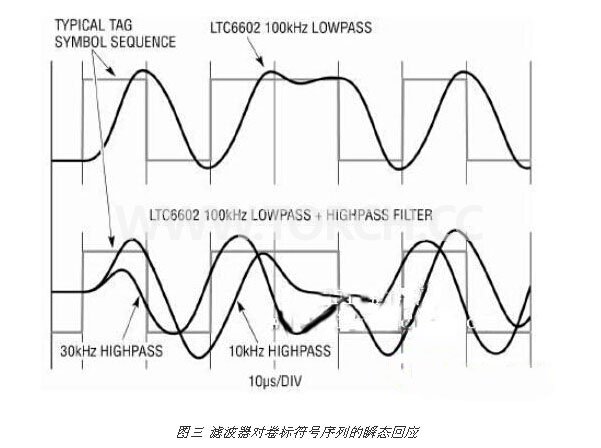 比較具 10kHz 和 30kHz 高通設(shè)置的濾波器輸出,10kHz 輸出的訊號(hào)躍變和時(shí)間間隔對(duì)于檢測(cè)符號(hào)序列而言是足夠的 (在 RFID 環(huán)境,噪聲將重迭在輸出訊號(hào)上)。總的來(lái)說(shuō),提高低通 fCUTOFF 和/或降低高通 fCUTOFF 意味著,以增大濾波器輸出噪聲為代價(jià)“提高”訊號(hào)躍變和時(shí)間間隔的“質(zhì)量”。