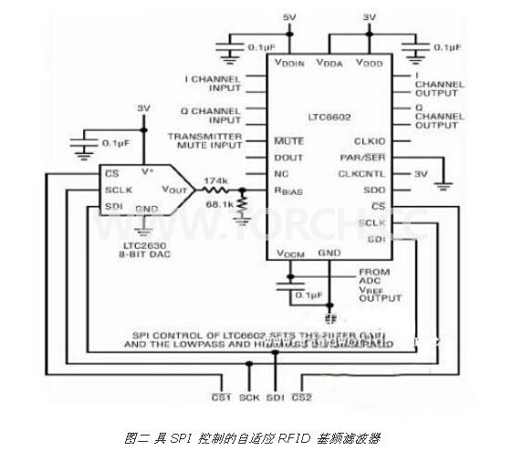 圖二顯示了一個(gè)簡(jiǎn)單和基于 LTC6602 的濾波器電路,該電路用 SPI 串行控制來(lái)改變?yōu)V波器的增益和帶寬,以適應(yīng)一套復(fù)雜的數(shù)據(jù)速率和編碼。(反向散射鏈路的頻率范圍為40kHz 至 640kHz,而數(shù)據(jù)速率范圍為 5kbps 至 640kbps。)