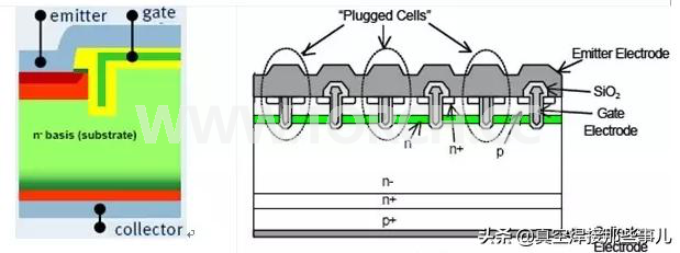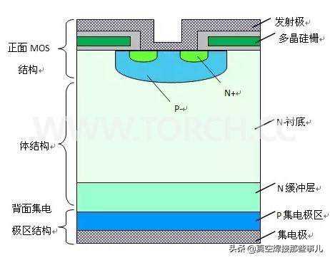 IGBT(真空共晶爐)芯片在結(jié)構(gòu)上是由數(shù)萬個(gè)元胞(重復(fù)單元)組成,工藝上采用大規(guī)模集成電路技術(shù)和功率器件技術(shù)制造而成[2]。每個(gè)元胞結(jié)構(gòu)如下圖2所示,可將其分成體結(jié)構(gòu)、正面MOS結(jié)構(gòu)及背面集電極區(qū)結(jié)構(gòu)三部分。
